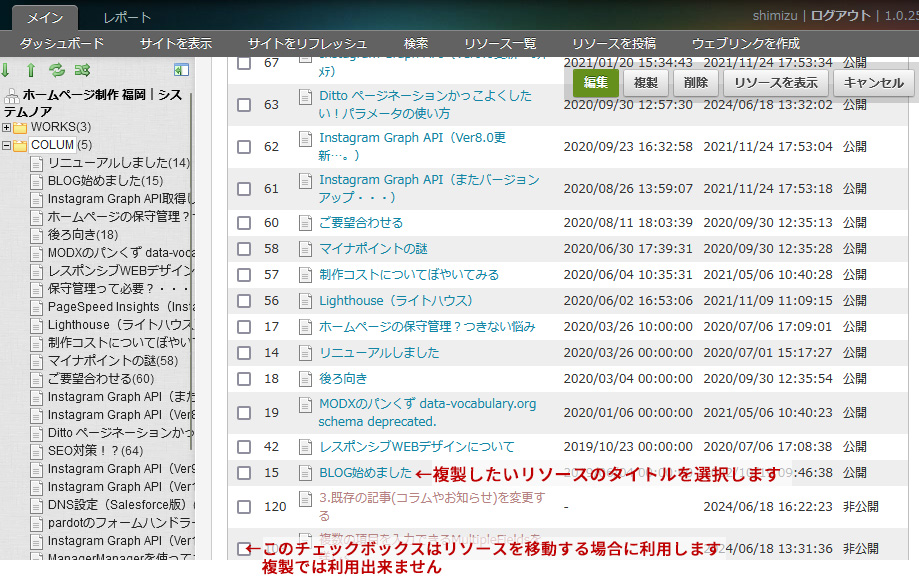 右画面へ投稿済みのリソース(記事)の一覧が表示されます。これはホームページへ表示されている並びと同じになっています。